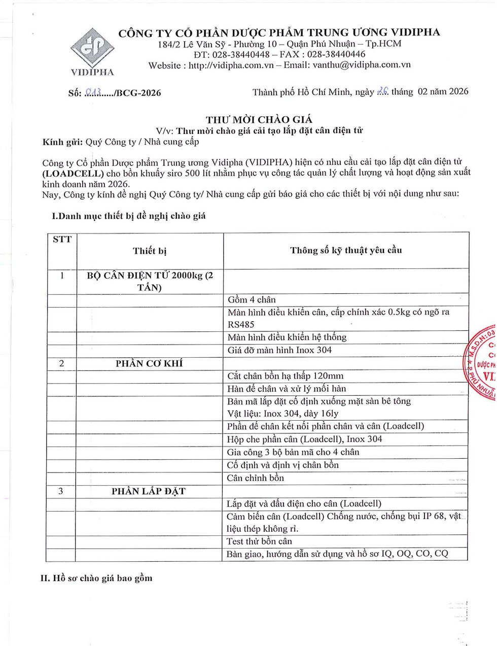 Thư mời chào giá cải tạo lắp đặt cần điện tử